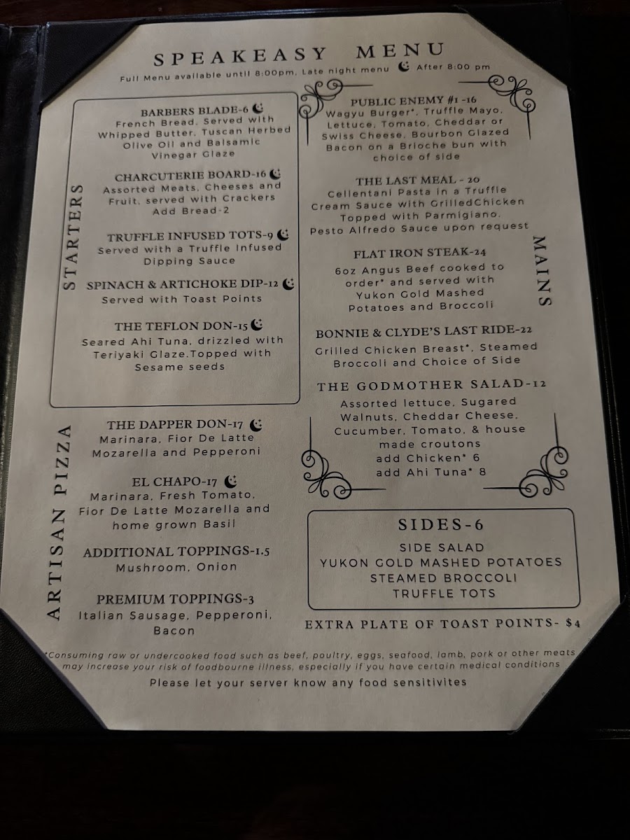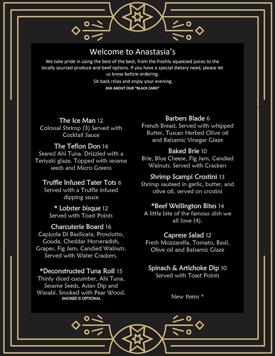 At Anastasia's Speakeasy, the menu reflects a refined yet approachable dining experience, blending carefully crafted cocktails with thoughtfully prepared small plates and shareable bites. The selection leans toward elevated bar fare—comforting yet sophisticated—perfect for unwinding after work or enjoying a relaxed evening out.